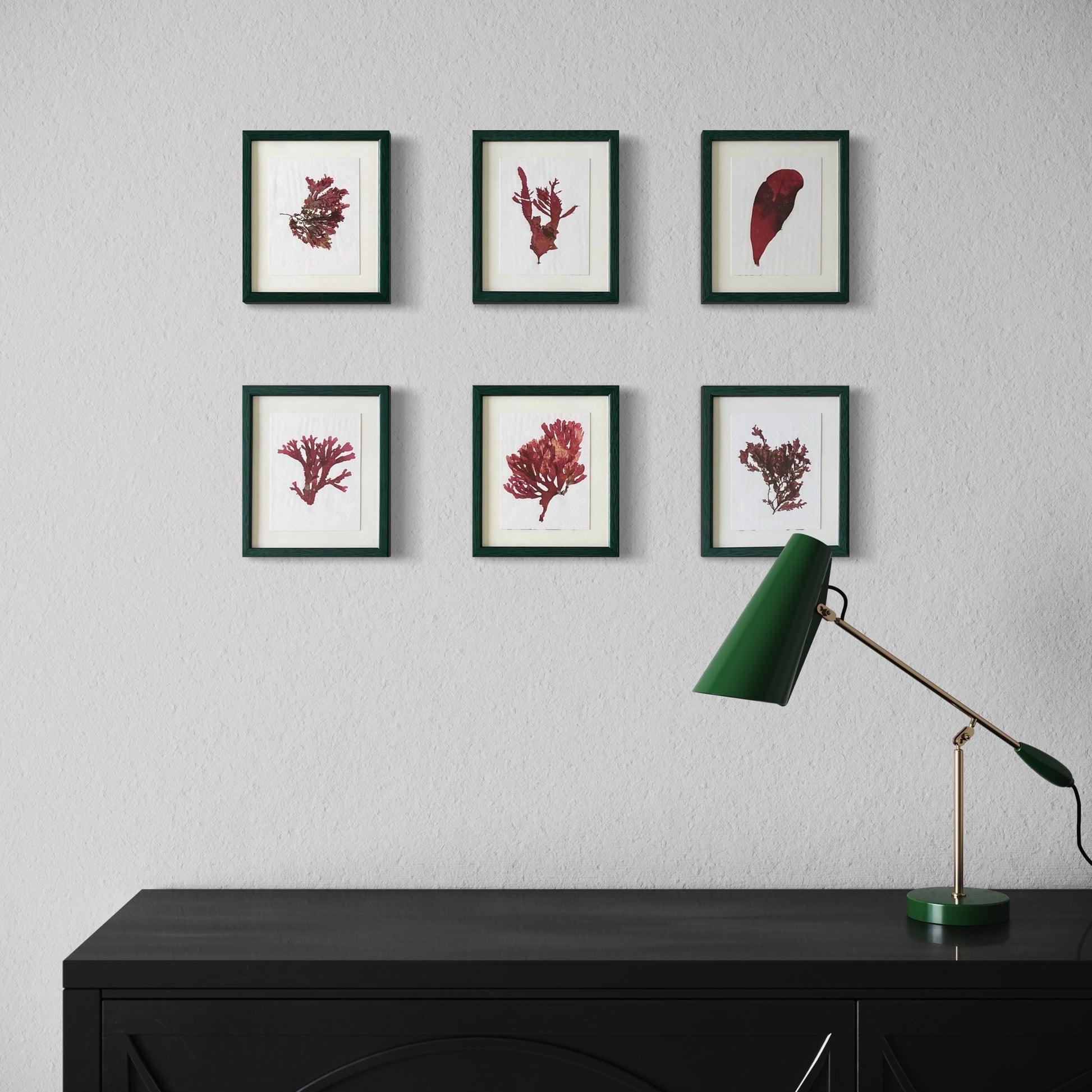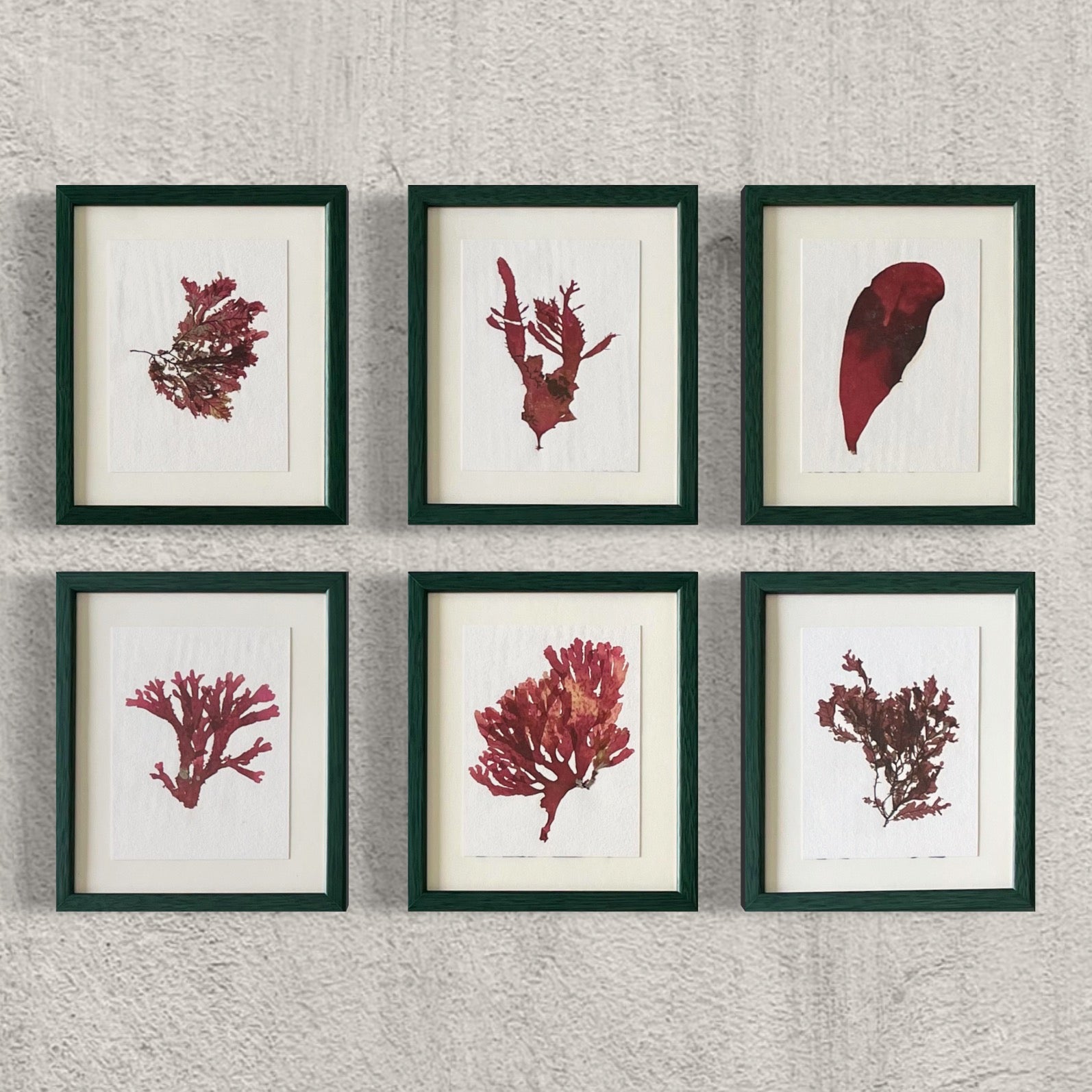 Celebrate the natural beauty of the ocean with these original seaweed pressings, set in elegant green wooden frames. Each piece can be hung vertically or horizontally, adding versatility to your decor.
