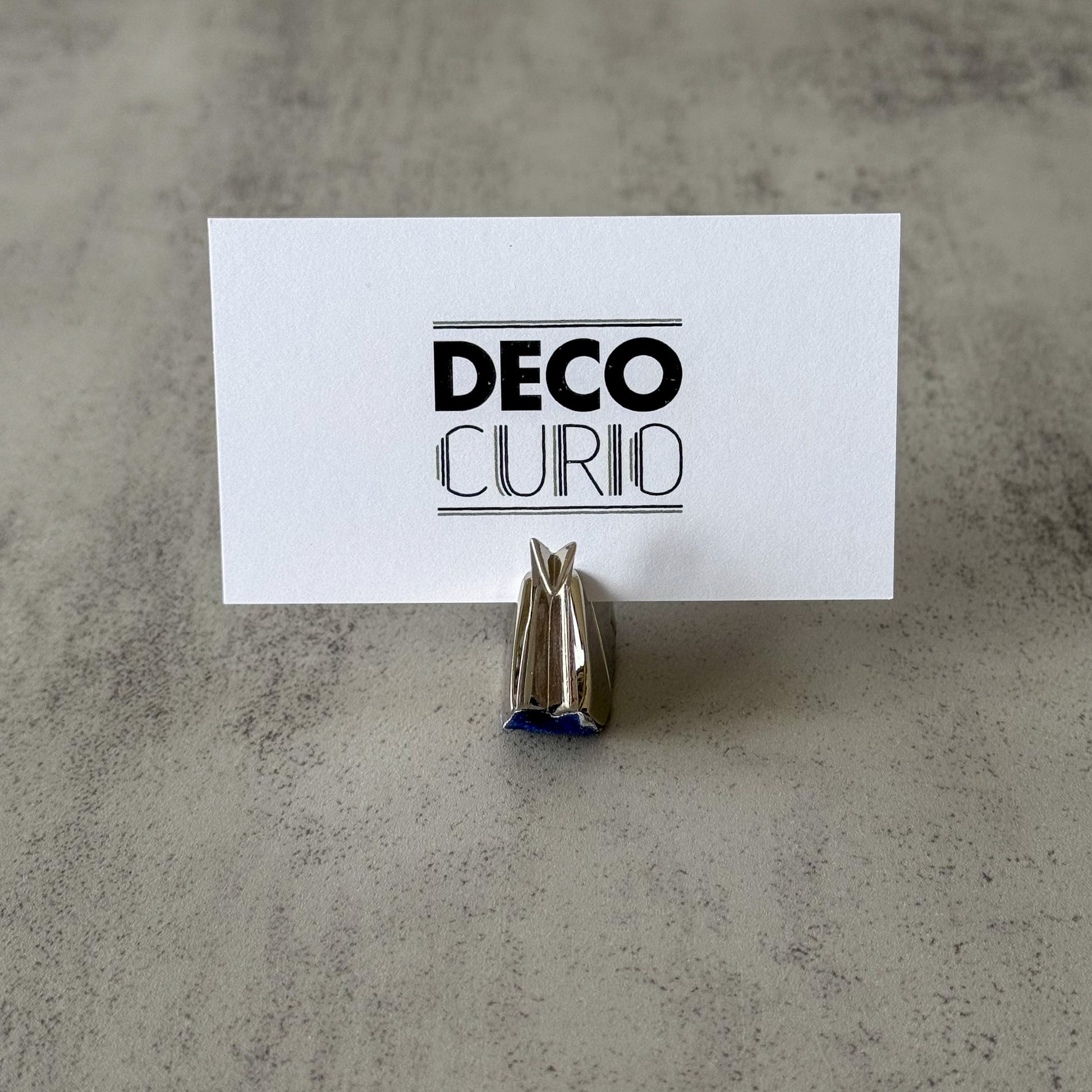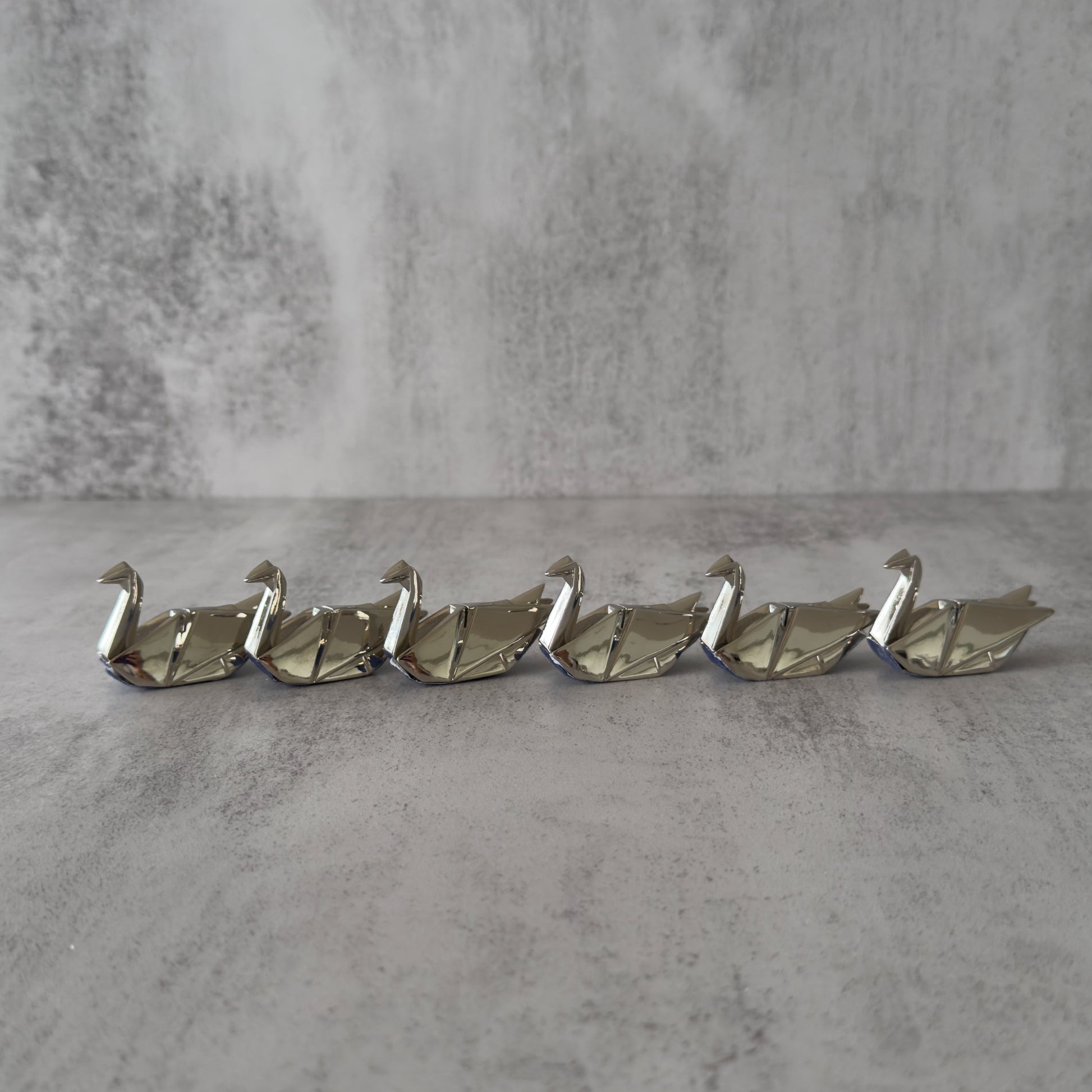 Enhance your table with this elegant and exceptionally rare set of six place card holders featuring intricate origami-inspired swan designs. These charming geometric folded swans are the perfect display pieces for place cards, menus, food labels, photographs and more, making them an ideal gift for dinner hosts, collectors and those with a refined appreciation for distinctive tableware. Crafted in silver-plated finish, this French vintage set represents a remarkable find for those seeking unique dining accessories.